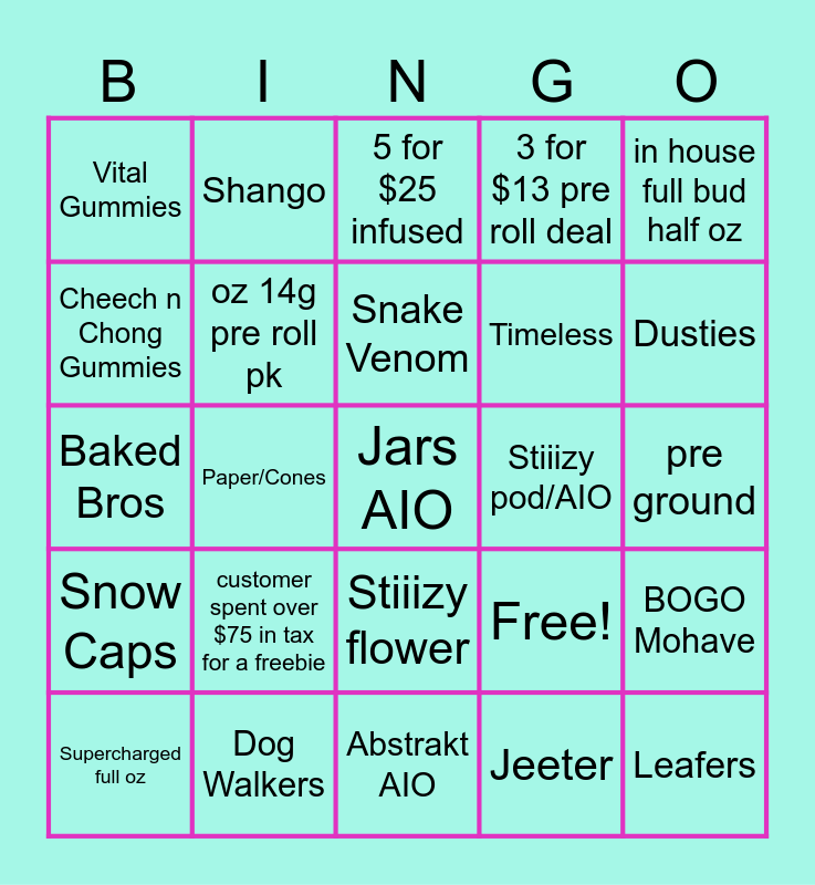 This bingo card has 25 words: customer spent over $75 in tax for a freebie, Abstrakt AIO, Snake Venom, Supercharged full oz, in house full bud half oz, Vital Gummies, Cheech n Chong Gummies, Shango, Stiiizy pod/AIO, Stiiizy flower, Timeless, Baked Bros, Free!, BOGO Mohave, oz 14g pre roll pk, Leafers, pre ground, 5 for $25 infused, Dusties, Paper/Cones, Jars AIO, Dog Walkers, Snow Caps, 3 for $13 pre roll deal and Jeeter.