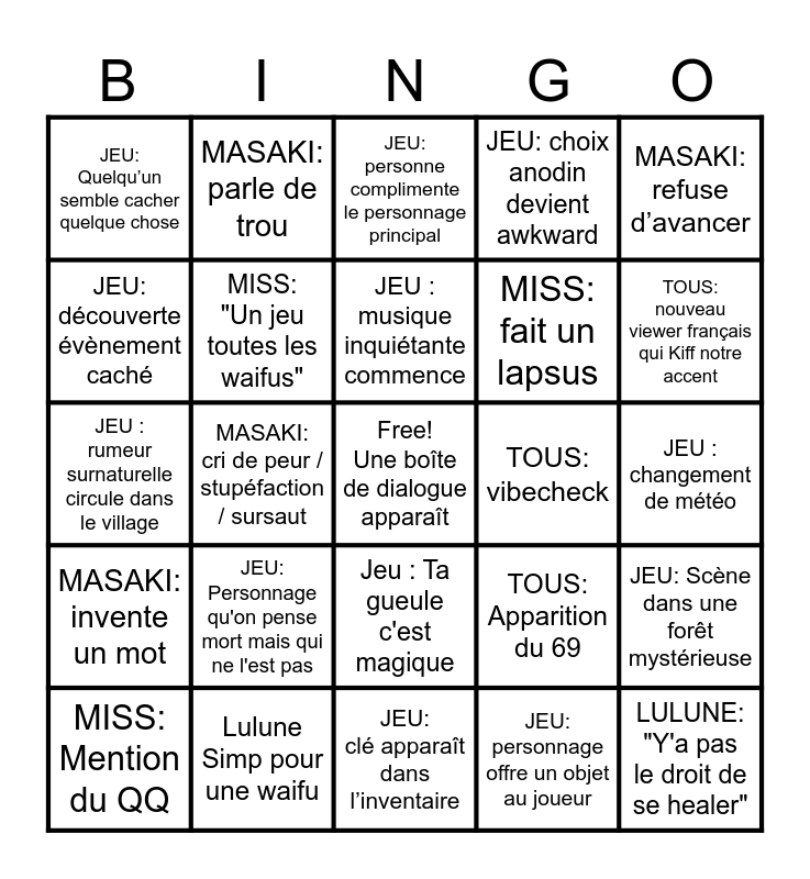 This bingo card has a free space and 88 words: Lulune : Sponsor me Pure Leaf, Lulune : Mention Games Grumps, Jeu : Ta gueule c'est magique, Lulune : Mention graine de David Bowie, Lulune : Cuys, problème technique, loki commentaire salace, Lulune : Débat meilleur Final Fantasy, Parler de bouffe, nouveau viewer: il est quel heure chez vous ?, Lulune : mama_gigi dans le chat, Lulune : intervention de la souris, JEU: Scène dans une forêt mystérieuse, JEU : changement de météo, JEU : personnage se retrouve dehors la nuit, JEU : musique inquiétante commence, JEU : zone qui semble abandonnée, JEU : mention d'un lieu “interdit”, JEU : symbole étrange apparaît, JEU : Quelqu’un parle de superstition, JEU : objet “maudit” ou “enchanté”, JEU : bougie ou lanterne s’éteint toute seule, JEU : rumeur surnaturelle circule dans le village, JEU : porte grince de façon dramatique, JEU: personnage offre un objet au joueur, JEU: conversation devient gênante, JEU: Quelqu’un pose une question bizarre, JEU: scène qui se termine abruptement, JEU: personnage paraît stressé, JEU: tâche domestique inattendue, JEU: personne complimente le personnage principal, JEU: choix anodin devient awkward, JEU: WTF moment, JEU: rencontre inattendue dans un endroit improbable, JEU: Personnage qu'on pense mort mais qui ne l'est pas, JEU: découverte évènement caché, JEU: Quelqu’un semble cacher quelque chose, MISS: Touche moé pas!, TOUS: double sauvegarde, TOUS: nouveau viewer français qui Kiff notre accent, MASAKI: cri de peur / stupéfaction / sursaut, LULUNE: Scusez la fatigue, LULUNE: Scusez la dyslexie, TOUS: Apparition du 69, TOUS: vibecheck, MISS: Chante Random, MISS: Aniki Jappe, MISS: WAAAAA AAAAAA AAA, LULUNE: Joke de graine et rire tout seul, MISS: fait un lapsus, LULUNE: "J'hais toute", JEU: sourire un peu… suspect, MASAKI: a des émotions (Triste/Ému), MASAKI: boit la Substance G, MASAKI: fait un jeu de mots (joke de papa), MASAKI: invente/ mélange une expression, MASAKI: invente un mot, MASAKI: parle de trou, TOUS: Consulte la carte plusieurs fois en 1 min, TOUS: Rate sa blague, MASAKI: blanc comme mon pelage!, TOUS: Lire le dialogue avec sa voix normale, LULUNE: Faire un commentaire ambigue, TOUS: Consulter plusieurs fois le menu en 1 min, MISS: Simp pour un perso, Lulune Simp pour une waifu, LULUNE: "Un jeu une waifu", MISS: "Un jeu toutes les waifus", MISS: Mention du QQ, LULUNE: "Y'a pas le droit de se healer", MASAKI: "deux comme mes queues", TOUS: Leloup parle de shiny, MASAKI: sait pas lire!, MASAKI: refuse d’avancer, MASAKI: paranoïde, MASAKI: regarde des endroits louches, MISS: laisse ses pensée intrusive gagnée, JEU: silence lourd, JEU: clé apparaît dans l’inventaire, JEU: moment où l’on hésite entre deux choix, JEU: action qui ne se passe pas comme prévu, JEU: mini-jeu ou une interaction spéciale, JEU: réaction faciale exagérée, JEU: bruit étrange hors-champ, JEU: Quelqu’un entre dans la scène AU MAUVAIS MOMENT, JEU: ligne de dialogue hilarante, JEU: situation trop dramatique pour rien and JEU: cliché volontairement exagéré.