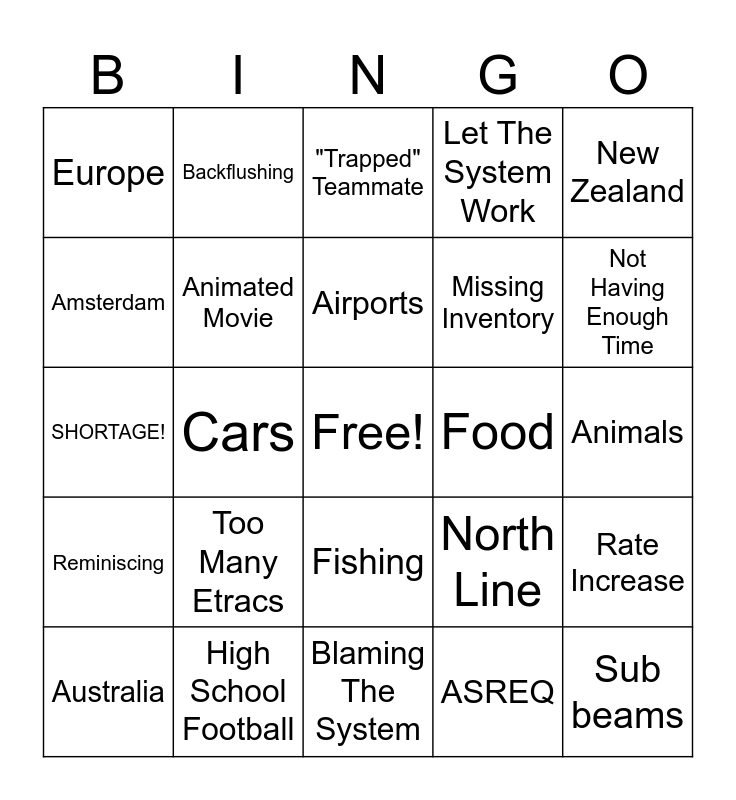 This bingo card has a free space and 24 words: Too Many Etracs, High School Football, Airports, Australia, New Zealand, Europe, Amsterdam, Backflushing, Food, Fishing, Missing Inventory, SHORTAGE!, North Line, Rate Increase, Animated Movie, ASREQ, Animals, "Trapped" Teammate, Not Having Enough Time, Cars, Sub beams, Reminiscing, Let The System Work and Blaming The System.