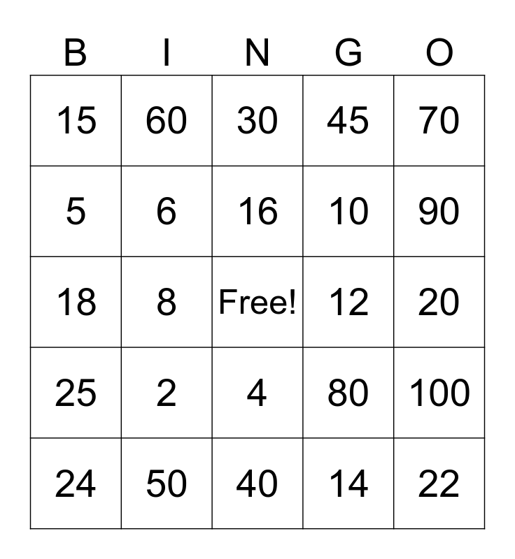 This bingo card has a free space and 24 words: 2, 50, 16, 24, 70, 15, 5, 60, 12, 4, 10, 18, 80, 100, 6, 14, 20, 30, 90, 8, 22, 25, 45 and 40.