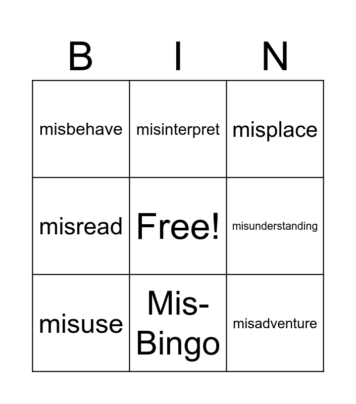 This bingo card has a free space and 10 words: Mis- Bingo, misplace, misbehave, misadventure, misread, misuse, misinterpret, mislead, misunderstanding and miscalculate.