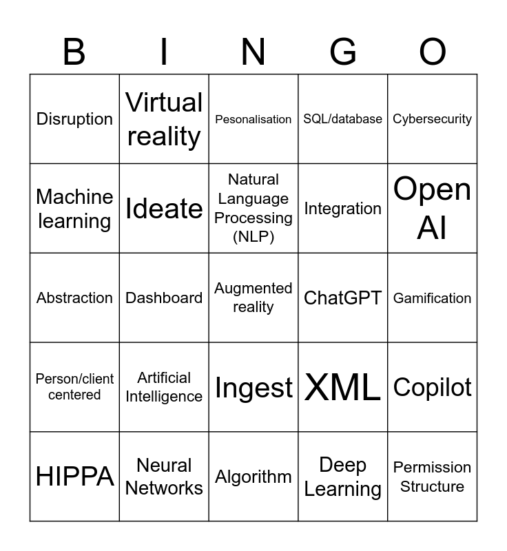 This bingo card has a free space and 24 words: Artificial Intelligence, Neural Networks, Natural Language Processing (NLP), HIPPA, Cybersecurity, Disruption, Machine learning, Virtual reality, ChatGPT, Ingest, Integration, Abstraction, XML, Copilot, Ideate, Deep Learning, Gamification, Pesonalisation, Open AI, Dashboard, Permission Structure, Person/client centered, SQL/database and Algorithm.