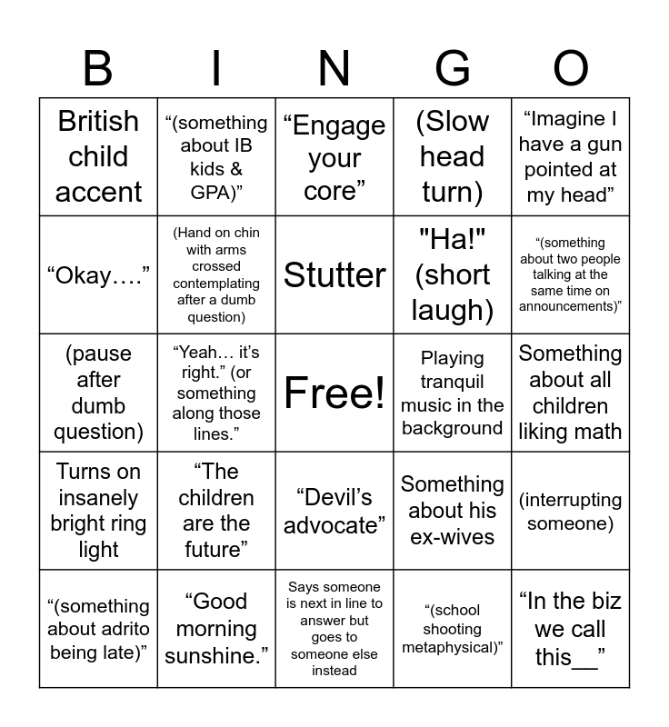 This bingo card has a free space and 24 words: “The children are the future”, “Good morning sunshine.”, Stutter, “(something about adrito being late)”, “Imagine I have a gun pointed at my head”, British child accent, “Okay….”, “(something about IB kids & GPA)”, Playing tranquil music in the background, “Devil’s advocate”, "Ha!" (short laugh), (pause after dumb question), Something about his ex-wives, (interrupting someone), (Hand on chin with arms crossed contemplating after a dumb question), “(school shooting metaphysical)”, Something about all children liking math, “Engage your core”, “(something about two people talking at the same time on announcements)”, “Yeah… it’s right.” (or something along those lines.”, “In the biz we call this__”, Turns on insanely bright ring light, (Slow head turn) and Says someone is next in line to answer but goes to someone else instead.