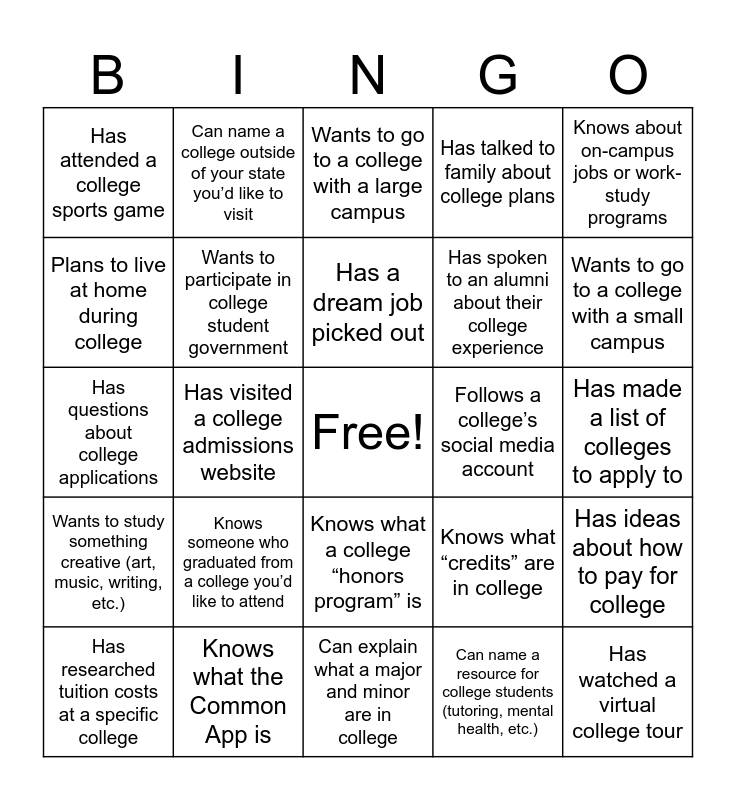 This bingo card has a free space and 25 words: Knows someone who graduated from a college you’d like to attend, Can explain what a major and minor are in college, Has a dream job picked out, Has researched tuition costs at a specific college, Knows about on-campus jobs or work-study programs, Has attended a college sports game, Plans to live at home during college, Can name a college outside of your state you’d like to visit, Follows a college’s social media account, Knows what a college “honors program” is, Has spoken to an alumni about their college experience, Has questions about college applications, Knows what “credits” are in college, Has ideas about how to pay for college, Wants to participate in college student government, Can name a college scholarship, Has made a list of colleges to apply to, Wants to go to a college with a large campus, Wants to go to a college with a small campus, Has visited a college admissions website, Has watched a virtual college tour, Knows what the Common App is, Wants to study something creative (art, music, writing, etc.), Has talked to family about college plans and Can name a resource for college students (tutoring, mental health, etc.).