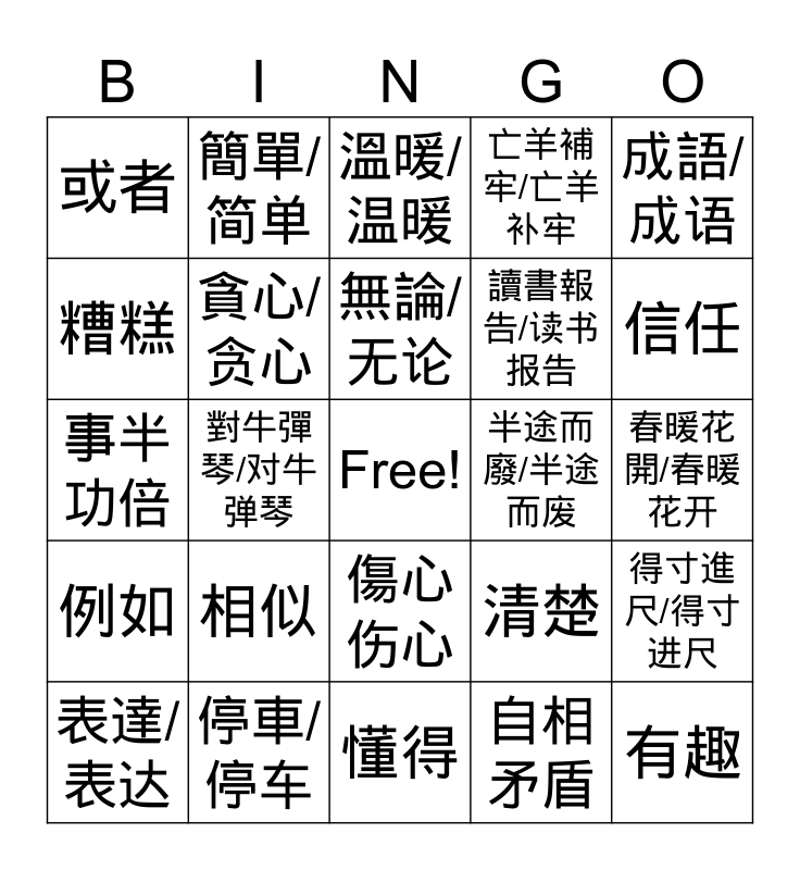 This bingo card has a free space and 27 words: 清楚, 文章, 讀書報告/读书报告, 懂得, 糟糕, 溫暖/温暖, 簡單/简单, 例如, 半途而廢/半途而废, 得寸進尺/得寸进尺, 事半功倍, 亡羊補牢/亡羊补牢, 表達/表达, 停車/停车, 信任, 白費/白费, 貪心/贪心, 無論/无论, 相似, 或者, 春暖花開/春暖花开, 自相矛盾, 對牛彈琴/对牛弹琴, 有趣, 傷心伤心, 成語/成语 and 發表會/发表会.