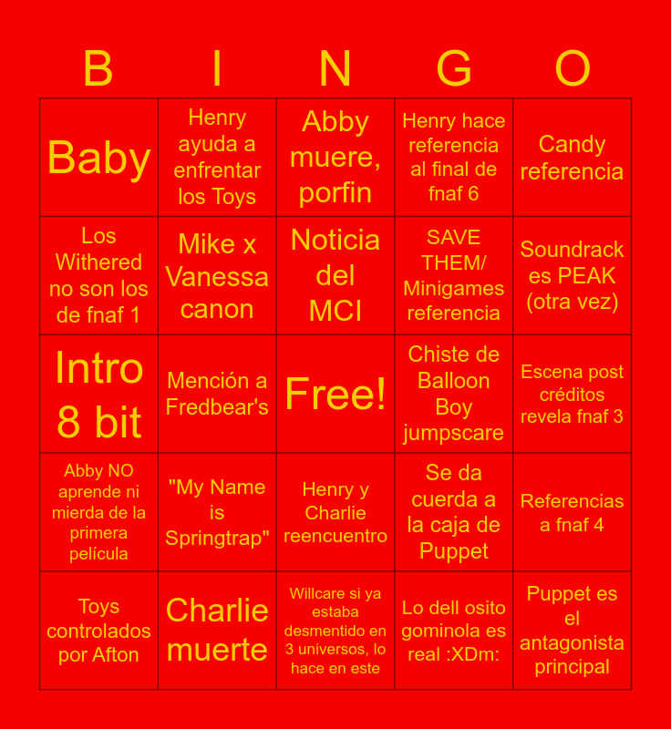 This bingo card has a free space and 24 words: "My Name is Springtrap", Charlie muerte, Noticia del MCI, Toys controlados por Afton, Candy referencia, Baby, Los Withered no son los de fnaf 1, Henry ayuda a enfrentar los Toys, Chiste de Balloon Boy jumpscare, Henry y Charlie reencuentro, SAVE THEM/ Minigames referencia, Intro 8 bit, Se da cuerda a la caja de Puppet, Referencias a fnaf 4, Mike x Vanessa canon, Lo dell osito gominola es real :XDm:, Escena post créditos revela fnaf 3, Abby muere, porfin, Soundrack es PEAK (otra vez), Mención a Fredbear's, Puppet es el antagonista principal, Abby NO aprende ni mierda de la primera película, Henry hace referencia al final de fnaf 6 and Willcare si ya estaba desmentido en 3 universos, lo hace en este.