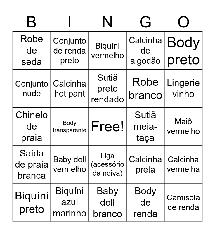 This bingo card has a free space and 51 words: Camisola preta, Camisola de renda, Camisola rosê, Baby doll branco, Baby doll vermelho, Baby doll estampado, Conjunto de renda preto, Conjunto de renda branco, Conjunto nude, Calcinha fio dental, Calcinha hot pant, Calcinha de algodão, Calcinha vermelha, Calcinha preta, Calcinha com renda, Sutiã básico nude, Sutiã preto rendado, Sutiã meia-taça, Body vermelho, Body preto, Body transparente, Body de renda, Robe de seda, Robe branco, Robe preto, Lingerie branca (noite de núpcias), Lingerie vinho, Lingerie floral, Biquíni preto, Biquíni vermelho, Biquíni neon, Biquíni tomara que caia, Biquíni estampado, Biquíni animal print, Biquíni rosa choque, Biquíni azul marinho, Biquíni branco, Maiô preto, Maiô cavado, Maiô estampado, Maiô vermelho, Saída de praia branca, Saída de praia preta, Saída de praia estampada, Chapéu de praia, Bolsa de praia, Chinelo de praia, Canga estampada, Canga branca, Liga (acessório da noiva) and Fantasia temática.