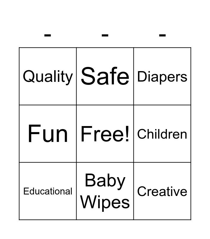 This bingo card has a free space and 8 words: Children, Diapers, Safe, Educational, Quality, Creative, Fun and Baby Wipes.
