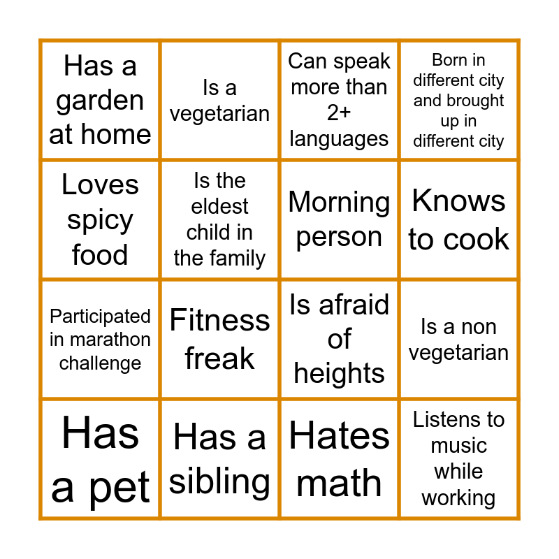 This bingo card has 16 words: Has a pet, Has a sibling, Can speak more than 2+ languages, Born in different city and brought up in different city, Loves spicy food, Is a vegetarian, Is afraid of heights, Is a non vegetarian, Has a garden at home, Is the eldest child in the family, Hates math, Knows to cook, Participated in marathon challenge, Fitness freak, Morning person and Listens to music while working.