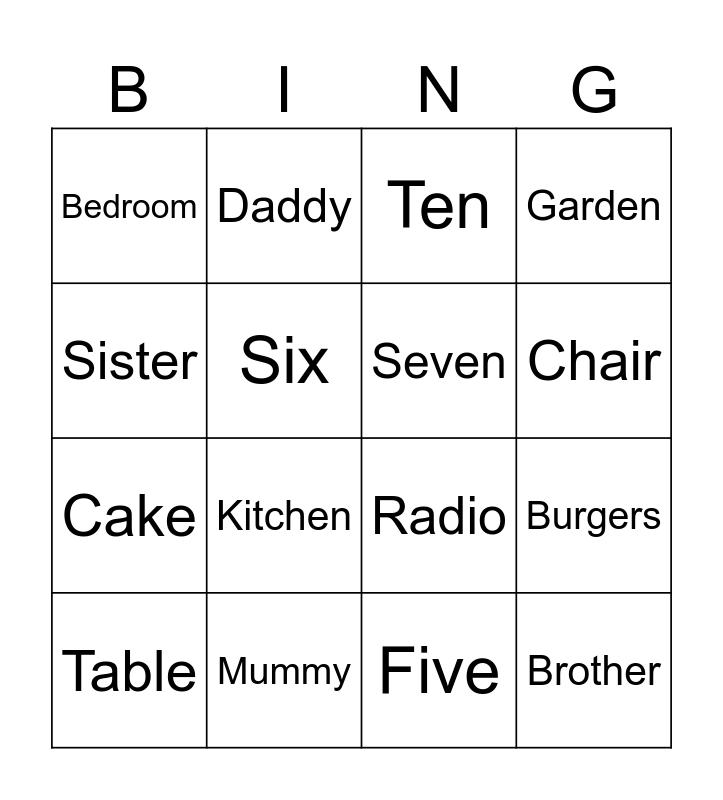 This bingo card has 16 words: Mummy, Burgers, Ten, Bedroom, Cake, Daddy, Radio, Five, Sister, Six, Table, Garden, Kitchen, Chair, Seven and Brother.