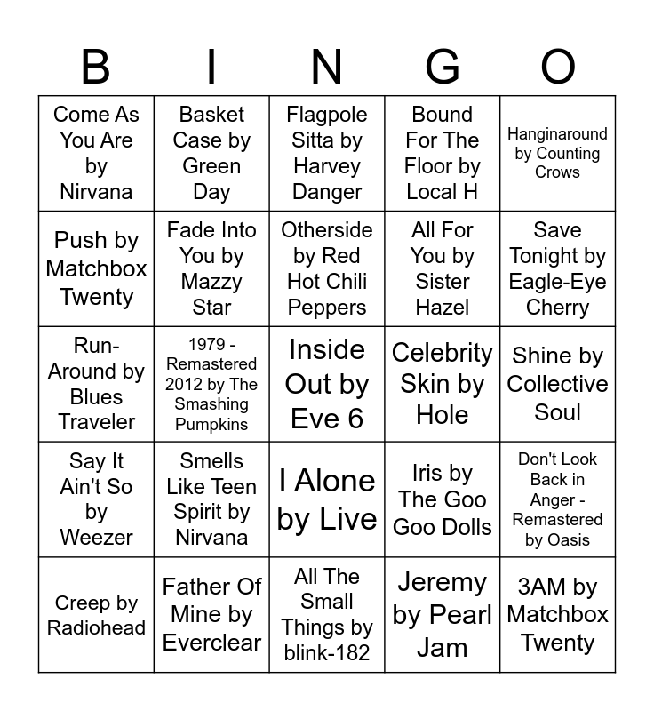 This bingo card has 53 words: Semi-Charmed Life by Third Eye Blind, Inside Out by Eve 6, Bullet With Butterfly Wings - Remastered 2012 by The Smashing Pumpkins, Jeremy by Pearl Jam, Smells Like Teen Spirit by Nirvana, Everlong by Foo Fighters, Basket Case by Green Day, Santeria by Sublime, Push by Matchbox Twenty, Black Hole Sun by Soundgarden, Fade Into You by Mazzy Star, If You Could Only See by Tonic, Don't Look Back in Anger - Remastered by Oasis, Iris by The Goo Goo Dolls, What It's Like by Everlast, Creep by Radiohead, Otherside by Red Hot Chili Peppers, Celebrity Skin by Hole, No Rain by Blind Melon, Hanginaround by Counting Crows, 1979 - Remastered 2012 by The Smashing Pumpkins, 3AM by Matchbox Twenty, All For You by Sister Hazel, Come As You Are by Nirvana, Only Happy When It Rains by Garbage, Father Of Mine by Everclear, Two Princes by Spin Doctors, Good Riddance (Time of Your Life) by Green Day, Hey Jealousy by Gin Blossoms, Save Tonight by Eagle-Eye Cherry, My Hero by Foo Fighters, Roll To Me by Del Amitri, Heart-Shaped Box by Nirvana, Machinehead - Remastered 2014 by Bush, Today - 2011 Remaster by The Smashing Pumpkins, Even Flow by Pearl Jam, Bound For The Floor by Local H, All The Small Things by blink-182, Flagpole Sitta by Harvey Danger, Buddy Holly by Weezer, Cryin' by Aerosmith, Interstate Love Song - 2019 Remaster by Stone Temple Pilots, Shine by Collective Soul, The Kids Aren't Alright by The Offspring, Til I Hear It From You by Gin Blossoms, I Alone by Live, Jumper - 1998 Edit by Third Eye Blind, The Distance by CAKE, Run-Around by Blues Traveler, Say It Ain't So by Weezer, Santa Monica by Everclear, Under the Bridge by Red Hot Chili Peppers and It's All Been Done by Barenaked Ladies.