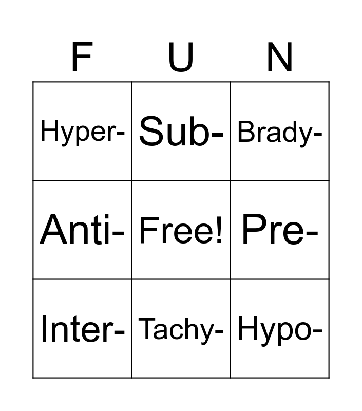 This bingo card has a free space and 10 words: Tachy-, Brady-, Hyper-, Hypo-, Anti-, Inter-, Sub-, Peri-, Pre- and Post-.