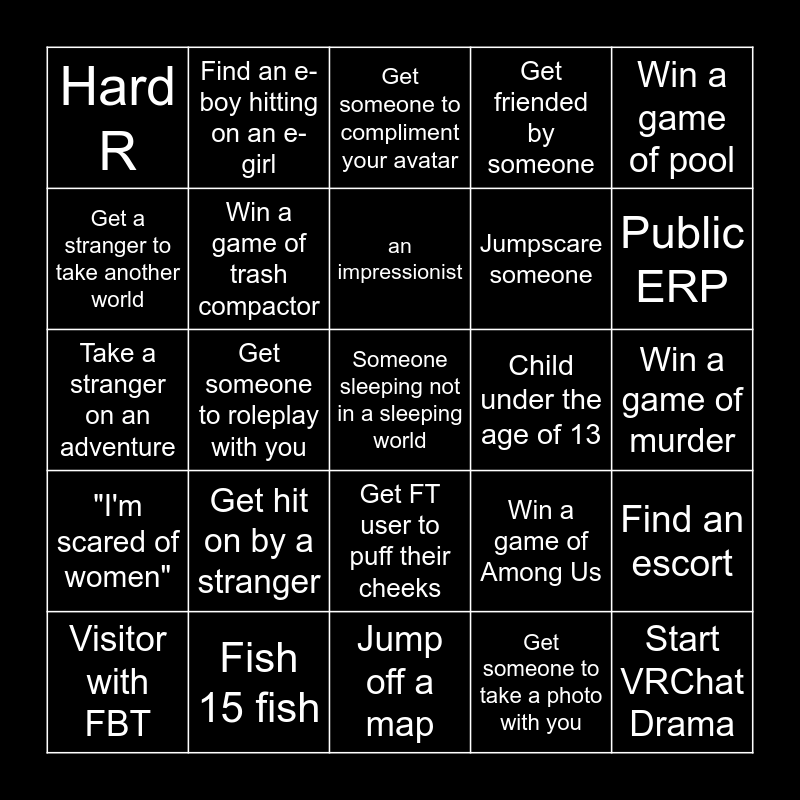 This bingo card has 25 words: Get hit on by a stranger, Jump off a map, an impressionist, Visitor with FBT, Win a game of pool, Hard R, Get a stranger to take another world, Find an e-boy hitting on an e-girl, Child under the age of 13, Get FT user to puff their cheeks, Jumpscare someone, Take a stranger on an adventure, Win a game of Among Us, Find an escort, Win a game of trash compactor, Start VRChat Drama, Win a game of murder, Get someone to compliment your avatar, Public ERP, Get someone to roleplay with you, Someone sleeping not in a sleeping world, Fish 15 fish, "I'm scared of women", Get friended by someone and Get someone to take a photo with you.