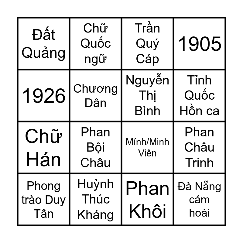 This bingo card has 16 words: Huỳnh Thúc Kháng, Phan Châu Trinh, Trần Quý Cáp, Đất Quảng, Chữ Hán, Chữ Quốc ngữ, Mính/Minh Viên, Phan Khôi, 1926, Chương Dân, Phong trào Duy Tân, 1905, Phan Bội Châu, Tỉnh Quốc Hồn ca, Nguyễn Thị Bình and Đà Nẵng cảm hoài.