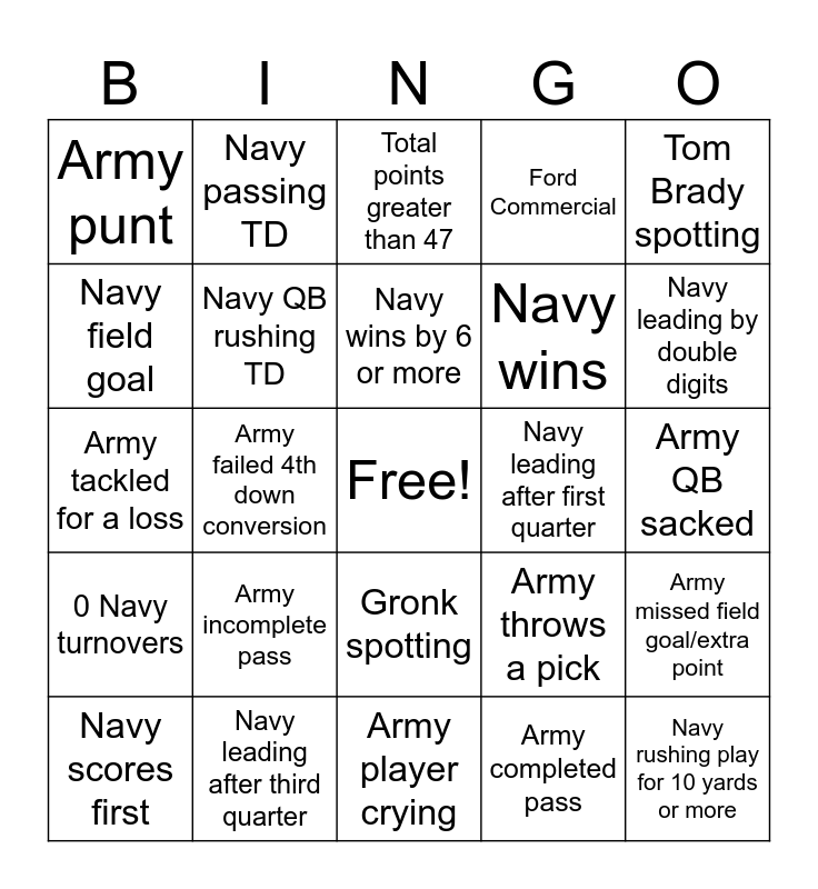 This bingo card has a free space and 27 words: Army throws a pick, Navy recovers a fumble, Navy wins, Army player crying, Navy field goal, Total points greater than 47, Navy passing TD, 0 Navy turnovers, Navy leading after first quarter, Army missed field goal/extra point, Army tackled for a loss, Ford Commercial, Navy scores first, Navy leading after third quarter, Navy leading by double digits, Navy leading at halftime, Navy QB rushing TD, Navy wins by 6 or more, Army incomplete pass, Army punt, Army QB sacked, Army completed pass, Army failed 4th down conversion, Navy rushing play for 10 yards or more, Gronk spotting, Tom Brady spotting and PICK 6.