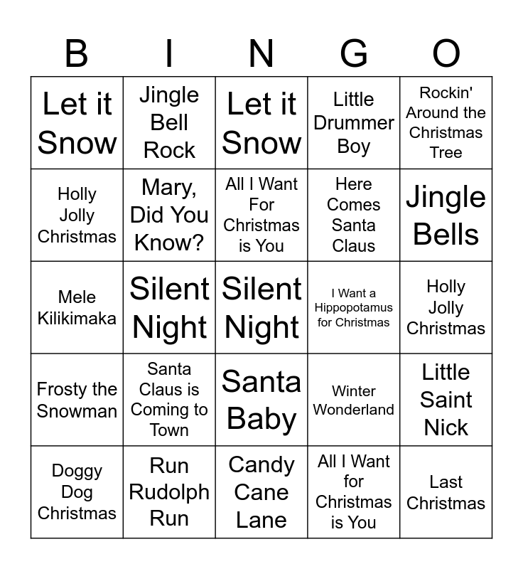 This bingo card has a free space and 24 words: Santa Claus is Coming to Town, Run Rudolph Run, All I Want For Christmas is You, Doggy Dog Christmas, Rockin' Around the Christmas Tree, Let it Snow, Holly Jolly Christmas, Jingle Bell Rock, I Want a Hippopotamus for Christmas, Santa Baby, Here Comes Santa Claus, Mele Kilikimaka, Winter Wonderland, Little Saint Nick, Mary, Did You Know?, All I Want for Christmas is You, Holly Jolly Christmas, Let it Snow, Jingle Bells, Silent Night, Last Christmas, Frosty the Snowman, Little Drummer Boy and Candy Cane Lane.