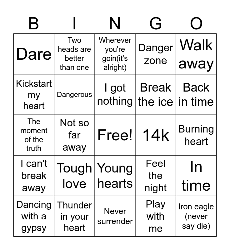 This bingo card has a free space and 32 words: Play with me, The boys and the girls are doing it, Not so far away, Father time, I can't break away, Dangerous, Walk away, In time, Two heads are better than one, The goonies r' good enough, I got nothing, Wherever you're goin(it's alright), Love is alive, What a thrill, 14k, She's so good to me, Dancing with a gypsy, The moment of the truth, Young hearts, Tough love, Feel the night, You're the best, Burning heart, Thunder in your heart, Iron eagle (never say die), Danger zone, Break the ice, Kickstart my heart, Dare, Never surrender, The power of love and Back in time.