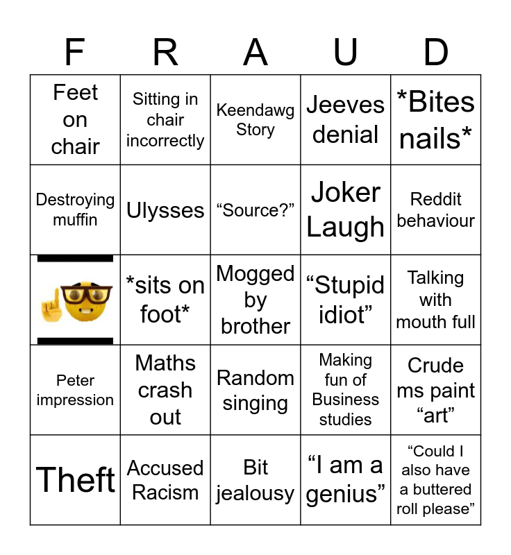 This bingo card has 1 images, a free space and 23 words: Maths crash out, Accused Racism, “Source?”, Theft, *Bites nails*, Feet on chair, Destroying muffin, Sitting in chair incorrectly, “Stupid idiot”, Random singing, Joker Laugh, Making fun of Business studies, Crude ms paint “art”, Ulysses, “I am a genius”, Talking with mouth full, Keendawg Story, Reddit behaviour, *sits on foot*, “Could I also have a buttered roll please”, Peter impression, Jeeves denial and Bit jealousy.