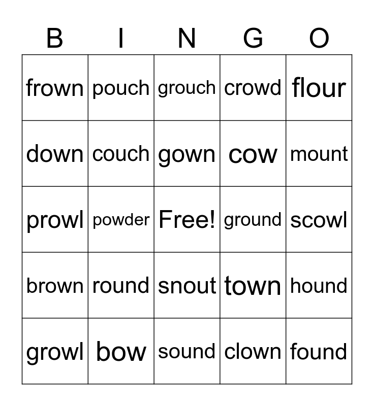 This bingo card has a free space and 59 words: bound, bow, brow, brown, clown, cloud, couch, count, cow, crown, crowd, crouch, down, drown, fowl, frown, found, flour, flower, gown, ground, grouch, growl, hound, howl, how, loud, mound, mount, mouth, now, our, out, plow, pouch, pout, power, powder, proud, prowl, prowler, round, scowl, scour, scout, shower, shout, slouch, snout, sound, south, sour, spout, sprout, stout, town, tower, trout and wound.