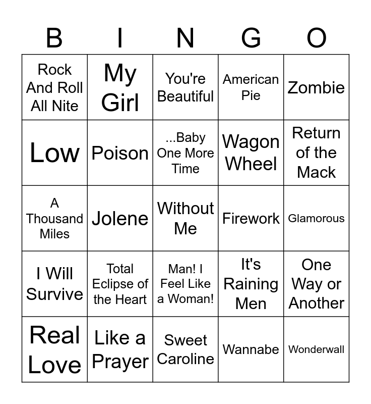 This bingo card has 38 words: Dancing Queen, Sk8er Boi, Come Together, Poison, One Way or Another, Total Eclipse of the Heart, ...Baby One More Time, F**k You, Zombie, Wagon Wheel, Jolene, American Pie, Without Me, Glamorous, Low, I Will Survive, Basket Case, You're Beautiful, I Love Rock N Roll, Firework, Rock And Roll All Nite, Like a Prayer, Return of the Mack, Real Love, Party In the USA, Sweet Caroline, Wonderwall, I Write Sins Not Tragedies, Last Resort, Never Gonna Give You Up, Listen To Your Heart, Man! I Feel Like a Woman!, Wannabe, My Girl, Free Fallin', It's Raining Men, A Thousand Miles and California Love.