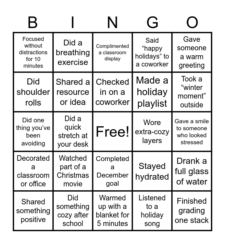 This bingo card has a free space and 144 words: Wore something festive, Drank hot cocoa or tea, Played holiday music, Took 5 calming breaths, Said no to unnecessary stress, Stayed hydrated, Did a quick stretch, Practiced gratitude, Celebrated a small win, Wore a holiday hat or accessory, Hung a decoration in your workspace, Shared a favorite holiday memory, Played a winter-themed song, Drank a warm beverage, Complimented a colleague, Wrote a thank-you note, Helped a student or coworker, Held the door for someone, Sent a cheerful email, Took a short walk outside, Did a 5-minute meditation, Drank a full glass of water, Took a screen break, Enjoyed a favorite snack mindfully, Sat quietly for 2 minutes, Did a quick stretch at your desk, Did a breathing exercise, Stepped outside during a break, Wrote down one thing you’re grateful for, Shared a positive story in class, Gave someone a high-five, Gave a student a small reward, Reached out to someone new, Gave a smile to someone who looked stressed, Brought a snack to share, Wore cozy socks, Shared a joke with a coworker, Took a picture of a decorated space, Made a holiday playlist, Listened to a holiday song, Watched something festive, Laughed with a coworker, Completed a December goal, Spread holiday cheer, Finished a task early, Held the door for someone, Took a real lunch break, Enjoyed a treat or snack, Took a walk in the winter air, Did something creative, Complimented a coworker, Left a kind note, Shared something positive, Asked someone about their holiday plans, Completed a task early, Planned your day in advance, Crossed off something on your to-do list, Said “no” to something unnecessary, Set a small goal for the day, Cleaned your workspace, Delegated a task, Listened to a holiday song, Watched a festive video, Shared a holiday memory, Gave a small gift or treat, Decorated a classroom or office, Sent a holiday message, Tried a seasonal drink or snack, Wore holiday colors, Played a short game or activity, Smiled at everyone you passed, Focused without distractions for 10 minutes, Did one thing you’ve been avoiding, Reviewed progress on a personal goal, Sipped peppermint mocha, Wore something sparkly, Added a holiday screensaver, Admired someone’s festive outfit, Said “happy holidays” to a coworker, Played a holiday song during prep, Enjoyed twinkly lights somewhere, Took a photo of something festive, Noticed a new decoration in the building, Shared a favorite holiday recipe, Took a “winter moment” outside, Noticed something pretty in the snow, Wore extra-cozy layers, Used hand lotion (hello, winter hands!), Warmed up with a blanket for 5 minutes, Enjoyed a warm comfort snack, Lit a winter-scented candle at home, Took a hot shower or bath after work, Wore boots or a scarf you love, Did something cozy after school, Took three deep breaths, Walked away from your desk, Decluttered a small area, Stayed off your phone for 10 minutes, Wrote down 3 things you’re grateful for, Took a mindful sip of a drink, Did shoulder rolls, Smiled at yourself in a mirror, Took a long inhale + slow exhale, Gave yourself permission to rest, Checked in on a coworker, Gave praise to a student, Held a positive conversation, Encouraged someone who needed it, Let someone go ahead of you, Shared a resource or idea, Thanked someone unexpectedly, Complimented a classroom display, Wrote a quick note of appreciation, Gave someone a warm greeting, Finished grading one stack, Prepped something a day early, Wiped down a workspace, Organized a small pile, Set a timer and completed a task, Cleared your desktop (digital or physical), Made a short to-do list, Checked off something satisfying, Deleted 10 emails, Prepared a lesson before leaving school, Laughed today, Shared a funny meme, Played a quick classroom game, Listened to a favorite song, Watched a short funny video, Did something just for you, Celebrated a tiny win, Took 1 minute to stretch and wiggle, Used a fun pen or sticker, Ate a treat guilt-free, Participated in a spirit day, Bought a small gift or treat, Wrapped one present, Wrote a holiday card, Finished some holiday prep, Watched part of a Christmas movie, Supported a local business, Donated to a toy/food drive, Tried a seasonal snack and Read something holiday-themed.
