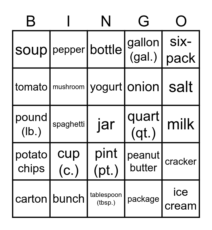 This bingo card has 43 words: box, jar, can, carton, loaf, package, bottle, bag, six-pack, bunch, gallon (gal.), quart (qt.), pint (pt.), cup (c.), ounce (oz.), tablespoon (tbsp.), teaspoon (tsp.), pound (lb.), sugar, salt, pepper, oil, flour, soup, water, milk, soda, juice, peanut butter, potato chips, cookies, cracker, bread, spaghetti, casserole, pizza, ice cream, yogurt, tomato, onion, potato, mushroom and cheese.