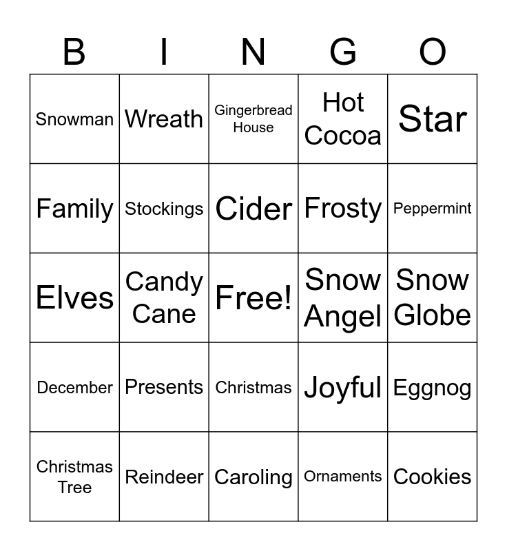 This bingo card has a free space and 29 words: Christmas Tree, Santa Claus, Candy Cane, Jingle Bells, Snowman, Gingerbread House, Stockings, Presents, Snow Angel, Reindeer, Snow Globe, Cookies, Caroling, Ornaments, Peppermint, North Pole, Christmas, December, Star, Elves, Joyful, Toys, Frosty, Family, Hot Cocoa, Wreath, Eggnog, Cider and Sleigh.