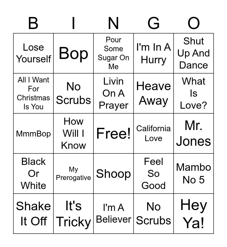 This bingo card has a free space and 24 words: My Prerogative, It's Tricky, Livin On A Prayer, Shake It Off, Shut Up And Dance, Lose Yourself, All I Want For Christmas Is You, Bop, California Love, Shoop, Heave Away, MmmBop, Feel So Good, Mambo No 5, No Scrubs, No Scrubs, Mr. Jones, Pour Some Sugar On Me, What Is Love?, How Will I Know, Hey Ya!, Black Or White, I'm In A Hurry and I'm A Believer.