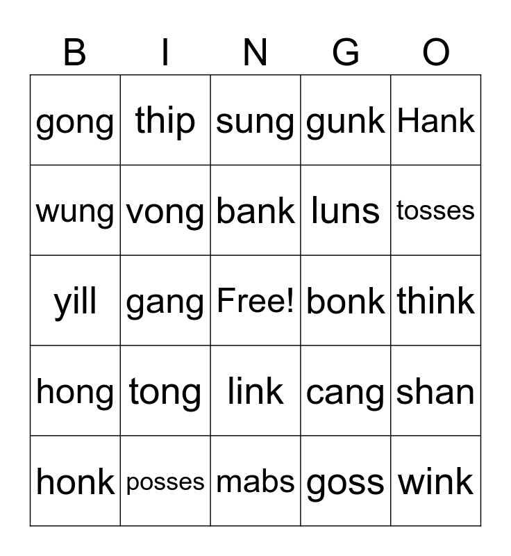 This bingo card has a free space and 39 words: fink, mink, hink, vong, honk, link, bank, dunk, Hank, hong, gang, gunk, wink, think, bonk, tong, bong, gong, thunk, cang, wung, mabs, luns, tosses, chips, jobs, mixes, thez, all, thip, fam, fang, sung, posses, goss, vob, shan, yill and push.