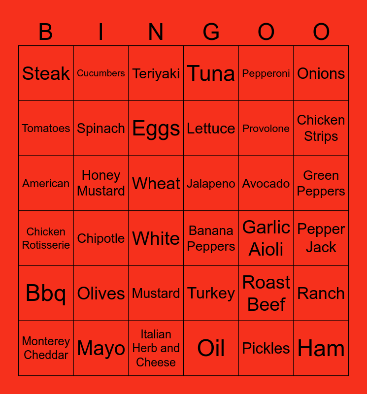 This bingo card has 41 words: Oil, Provolone, Ranch, Tomatoes, Banana Peppers, Green Peppers, Spinach, Wrap, Pepperoni, Jalapeno, Chicken Strips, Tuna, American, Wheat, Honey Mustard, Avocado, Monterey Cheddar, Steak, Pickles, Teriyaki, Chipotle, Bbq, Garlic Aioli, Eggs, Ham, Roast Beef, Pepper Jack, Vinegar, Lettuce, Olives, Parmesan Cheese, Cucumbers, White, Mayo, Chicken Rotisserie, Onions, Mustard, Ranch, Italian Herb and Cheese, Turkey and Bacon.