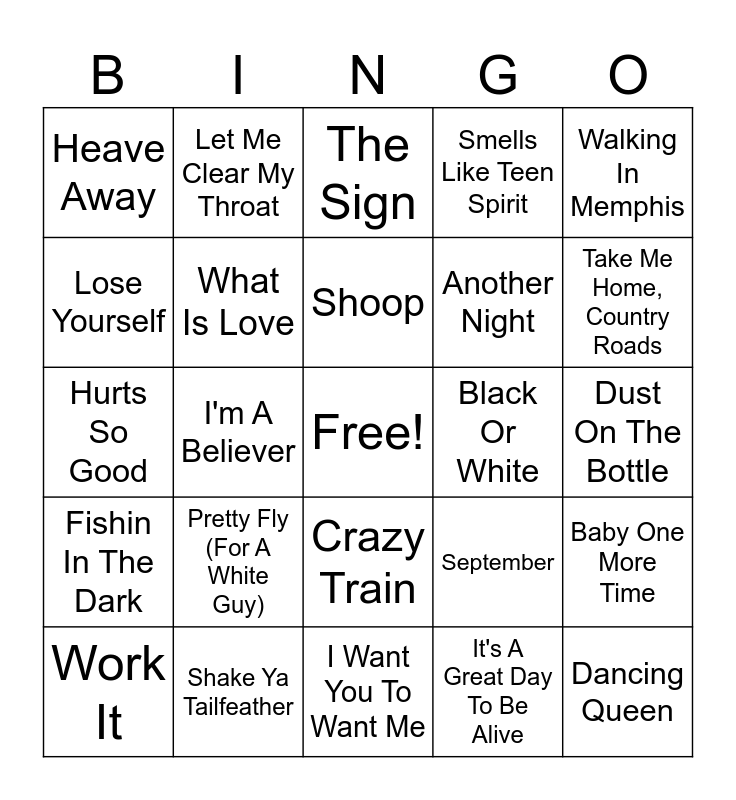 This bingo card has a free space and 24 words: Pretty Fly (For A White Guy), Shake Ya Tailfeather, Shoop, Work It, Walking In Memphis, Heave Away, Lose Yourself, Let Me Clear My Throat, Black Or White, Crazy Train, Another Night, Hurts So Good, September, Baby One More Time, What Is Love, It's A Great Day To Be Alive, Dust On The Bottle, The Sign, Take Me Home, Country Roads, I'm A Believer, Dancing Queen, Fishin In The Dark, Smells Like Teen Spirit and I Want You To Want Me.