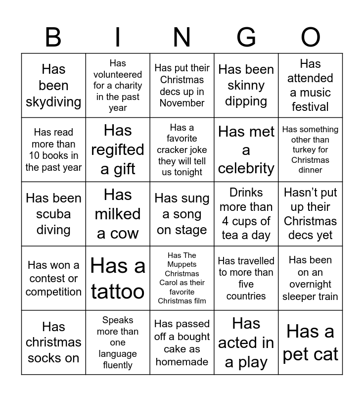 This bingo card has 25 words: Has a tattoo, Has passed off a bought cake as homemade, Has a favorite cracker joke they will tell us tonight, Has christmas socks on, Has attended a music festival, Has been skydiving, Has read more than 10 books in the past year, Has volunteered for a charity in the past year, Drinks more than 4 cups of tea a day, Has The Muppets Christmas Carol as their favorite Christmas film, Has met a celebrity, Has been scuba diving, Has travelled to more than five countries, Has been on an overnight sleeper train, Has regifted a gift, Has a pet cat, Hasn’t put up their Christmas decs yet, Has put their Christmas decs up in November, Has something other than turkey for Christmas dinner, Has milked a cow, Has sung a song on stage, Speaks more than one language fluently, Has won a contest or competition, Has been skinny dipping and Has acted in a play.