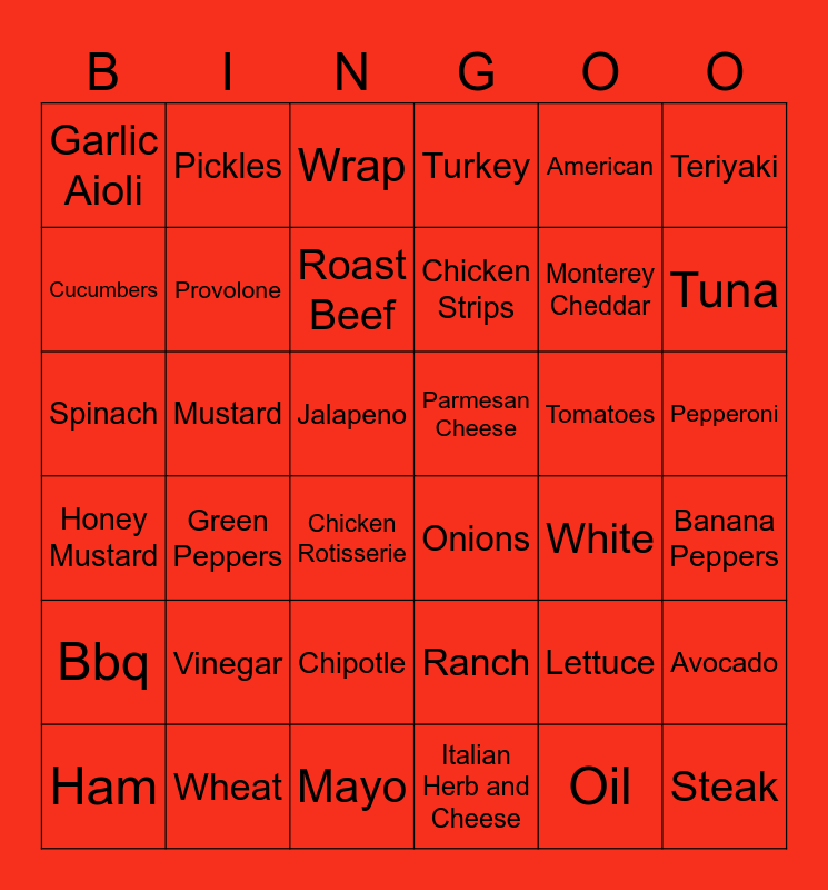 This bingo card has 42 words: Oil, Provolone, Free!, Tomatoes, Banana Peppers, Green Peppers, Spinach, Salami, Wrap, Pepperoni, Jalapeno, Chicken Strips, Tuna, American, Wheat, Honey Mustard, Avocado, Monterey Cheddar, Steak, Pickles, Teriyaki, Chipotle, Bbq, Garlic Aioli, Eggs, Ham, Roast Beef, Pepper Jack, Vinegar, Lettuce, Olives, Parmesan Cheese, Cucumbers, White, Mayo, Chicken Rotisserie, Onions, Mustard, Ranch, Italian Herb and Cheese, Turkey and Bacon.