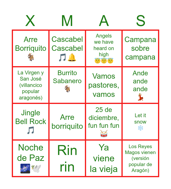 This bingo card has 74 words: 12 Days of Christmas ⓵②, Canta, ríe, bebe 🍻, Angels we have heard on high 😇😇😇, Away in a manger 🧺🌿, Los peces en el río 🐠🐟🐡, Deck the halls 🥳, Campana sobre campana 🔔🔔, Feliz Navidad 🎄, The First Noel ①👶🏼, Ay del Chiquirritín👼🏼, Hark! the herald angels sing 😇, I saw Mummy kissing Santa 🎅🏽, Jingle Bell Rock 🎵, Burrito Sabanero 🐐, Joy to the world 😊🌎, Let it snow ❄️, En el portal de Belén ⭐️, Noche de Paz 🌌🕊, Oh Blanca Navidad ❄️⛄️🏔, 25 de diciembre, fun fun fun 🥁, Ande ande ande 💃🏼, Arre Borriquito🐐, Cascabel Cascabel 🎵🔔, Hacia Belén va una burra, rin rin 🐴🎶, Ya viene la vieja, La Tarara del Niño (“Tarara tarara, que ha nacido el niño”), El niño Dios ha nacido, A Belén pastores (versión aragonesa), Alegría, alegría (tradicional aragonesa), Hacia Belén va una burra (versión aragonesa), La Virgen y San José (villancico popular aragonés), Hoy es nochebuena, buenos mozos (jota villancico), Vamos a Belén, zagales (villancico-jota), Los mozos de mi lugar van a rondar al Niño, En Belén tocan a fuego (versión aragonesa), Jota del Nacimiento, Jota a la Virgen María (villancico), Jota de Navidad – de las rondallas tradicionales, Jota al Niño Dios, Gloria bendita en Belén (villancico tradicional), La pastora María (romance navideño aragonés), Los Reyes Magos vienen (versión popular de Aragón), El rosariero (canto de invierno que se usaba en Navidad), Campanas de Belén (versión folklórica aragonesa), Los peces en el río, Campana sobre campana, Dime Niño, de quién eres, Arre borriquito, El burrito sabanero (llegó a España a finales de los 60), La marimorena, Ande, ande, ande, la marimorena, Pero mira cómo beben, El Niño del tambor (El tamborilero), Ay del chiquirritín, Pastores venid, A la nanita nana, Las doce palabras (tradicional castellano), Zagala bonita ven, A Belén pastores (versión tradicional española), Rin rin, Vamos pastores, vamos, Madre en la puerta hay un Niño, En el portal de Belén, Noche de paz (versión española), El Tamborilero – Raphael (1965), Blanca Navidad – versiones españolas, Noche de paz – varias versiones, Ven a mi casa esta Navidad – Luis Aguilé, Zagalillos del portal – Coros de los 50–60, El mensajero del Niño – Coros infantiles, En Navidad – Villancico moderno antiguo, Adeste Fideles – versiones corales españolas, Hacia Belén va una burra (versión moderna de los 60) and Los pastores a Belén – Coros de Radio Nacional.