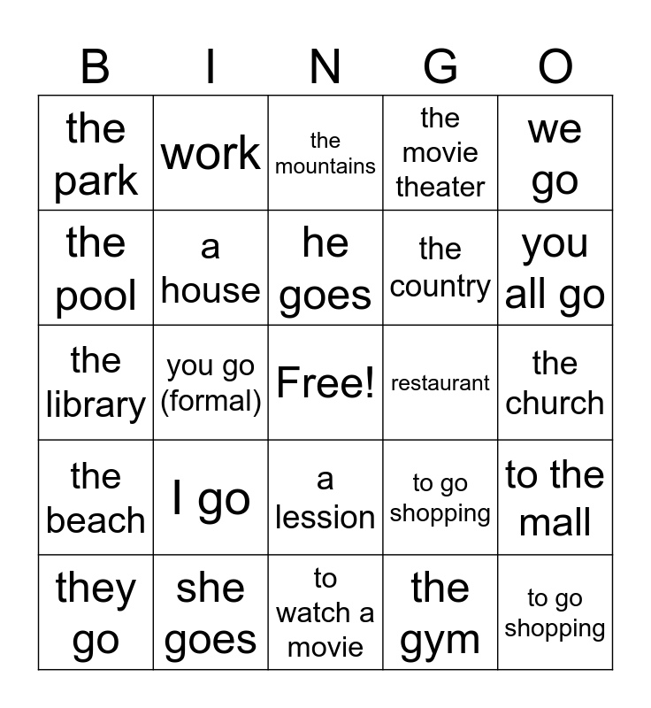 This bingo card has a free space and 24 words: I go, she goes, he goes, they go, we go, the park, the pool, work, restaurant, a lession, the country, the library, to go shopping, to the mall, a house, the gym, the church, the mountains, you all go, you go (formal), to go shopping, the beach, the movie theater and to watch a movie.