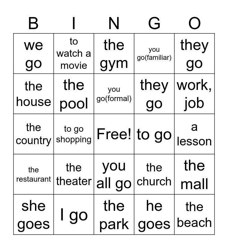 This bingo card has a free space and 24 words: the theater, I go, you go(formal), she goes, they go, we go, the house, to watch a movie, to go, you all go, they go, the country, the church, the mall, the pool, he goes, a lesson, the gym, work, job, to go shopping, the beach, the restaurant, you go(familiar) and the park.