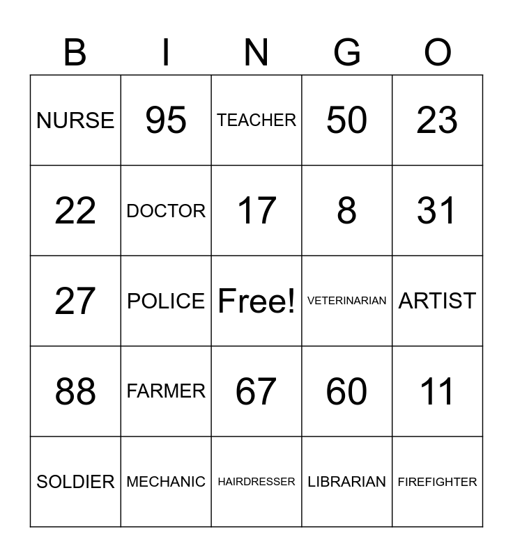 This bingo card has a free space and 29 words: SOLDIER, PILOT, POLICE, DENTIST, NURSE, TEACHER, DOCTOR, FARMER, VETERINARIAN, MECHANIC, ARTIST, FIREFIGHTER, HAIRDRESSER, LIBRARIAN, 31, 100, 67, 88, 23, 27, 60, 1, 8, 22, 50, 95, 11, 17 and 99.