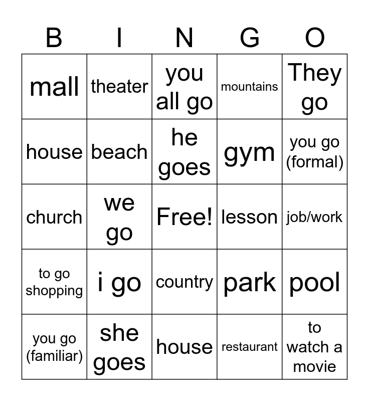 This bingo card has a free space and 24 words: i go, she goes, he goes, you go (familiar), They go, mall, house, theater, lesson, country, gym, church, park, pool, beach, restaurant, job/work, you all go, you go (formal), we go, to watch a movie, to go shopping, mountains and house.