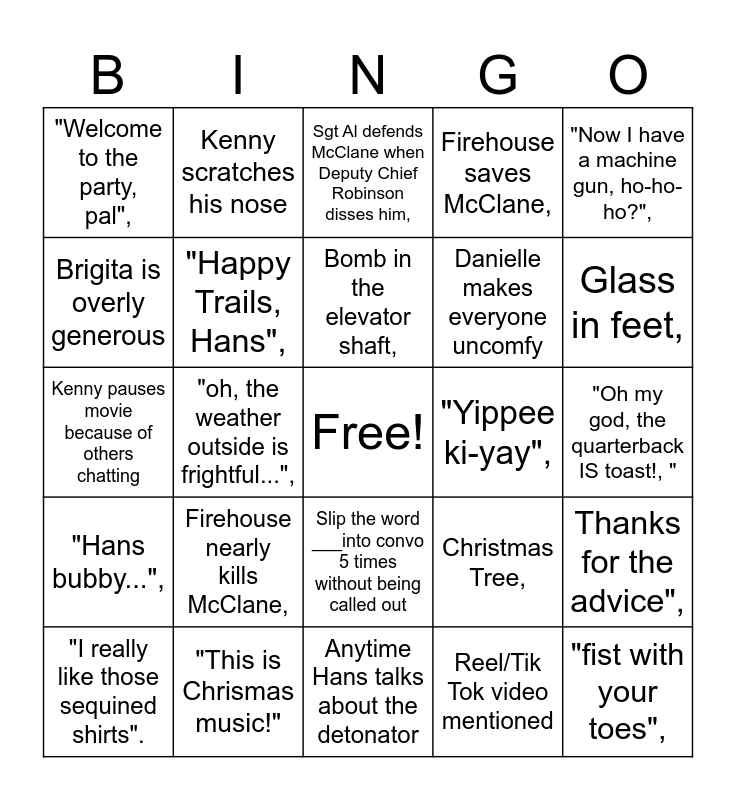This bingo card has a free space and 36 words: A helicopter explodes,, John McClane laughs,, Someone lights a cigarette,, "Happy Trails, Hans",, Christmas Tree,, "Hans bubby...",, Bomb in the elevator shaft,, Five police cars at once,, "Now I have a machine gun, ho-ho-ho?",, McClane talks to himself,, "oh, the weather outside is frightful...",, Firehouse saves McClane,, "Heisinki, Sweden",, "Yippee ki-yay",, Glass in feet,, "Welcome to the party, pal",, I'm going to count to three. There will not be a four?,, Firehouse nearly kills McClane,, "fist with your toes",, Sgt Al defends McClane when Deputy Chief Robinson disses him,, "Oh my god, the quarterback IS toast!, ", Thanks for the advice",, "This is Chrismas music!", "I really like those sequined shirts"., Anytime Hans talks about the detonator, Kenny scratches his nose, Kenny pauses movie because of others chatting, Heather laughs at her own joke, Danielle makes everyone uncomfy, Brigita is overly generous, Donny looks lovingly at Heather being silly, 3W love triangle is mentioned, Reel/Tik Tok video mentioned, Slip the word ___into convo 5 times without being called out, Find Danielle’s Bathroom Review book and leave a review and Kenny is scared of Brigita's Stare.