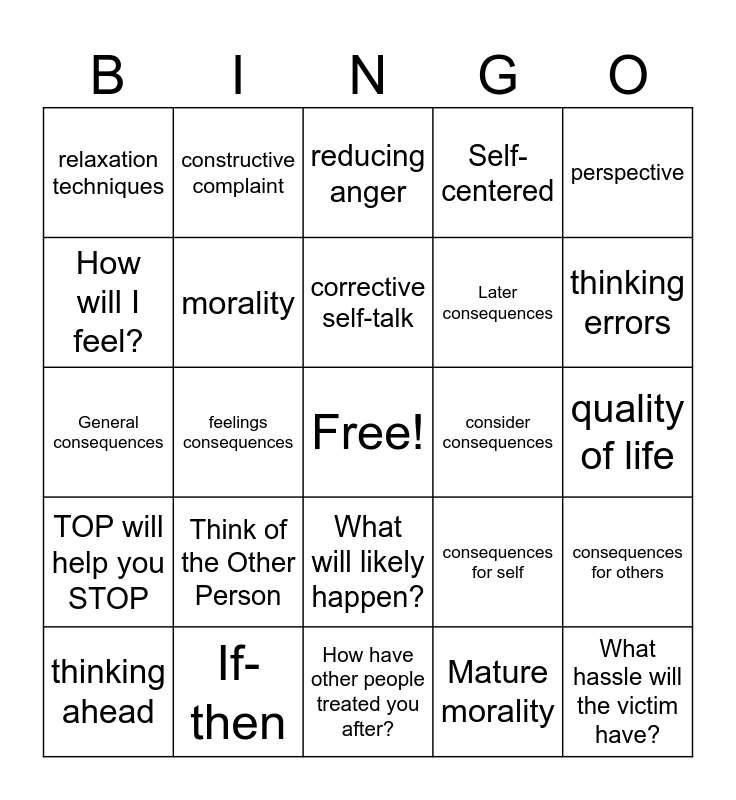 This bingo card has a free space and 24 words: Think of the Other Person, If-then, corrective self-talk, thinking ahead, perspective, relaxation techniques, How will I feel?, constructive complaint, consider consequences, What will likely happen?, Later consequences, General consequences, consequences for self, consequences for others, morality, Mature morality, quality of life, reducing anger, thinking errors, feelings consequences, What hassle will the victim have?, TOP will help you STOP, Self-centered and How have other people treated you after?.