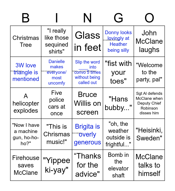 This bingo card has 10 images, a free space and 35 words: Kenny scratches his nose, Kenny pauses movie because of others chatting, Heather laughs at her own joke, Danielle makes everyone/ most uncomfy, Brigita is overly generous, Donny looks lovingly at Heather being silly, 3W love triangle is mentioned, Reel/Tik Tok video mentioned, Slip the word ____ into convo 5 times without being called out, Find Danielle’s Bathroom Review book and leave a review, A helicopter explodes, John McClane laughs, Someone lights a cigarette,, "Happy Trails, Hans", Christmas Tree, "Hans bubby...", Bomb in the elevator shaft, Five police cars at once, "Now I have a machine gun, ho-ho-ho?", McClane talks to himself, "oh, the weather outside is frightful...", Firehouse saves McClane, "Heisinki, Sweden", "Yippee ki-yay", Glass in feet, "Welcome to the party, pal", I'm going to count to three. There will not be a four?, Firehouse nearly kills McClane, "fist with your toes", Sgt Al defends McClane when Deputy Chief Robinson disses him, "Oh my god, the quarterback IS toast!”, “Thanks for the advice", "This is Chrismas music!", "I really like those sequined shirts" and Anytime Hans talks about the detonator.
