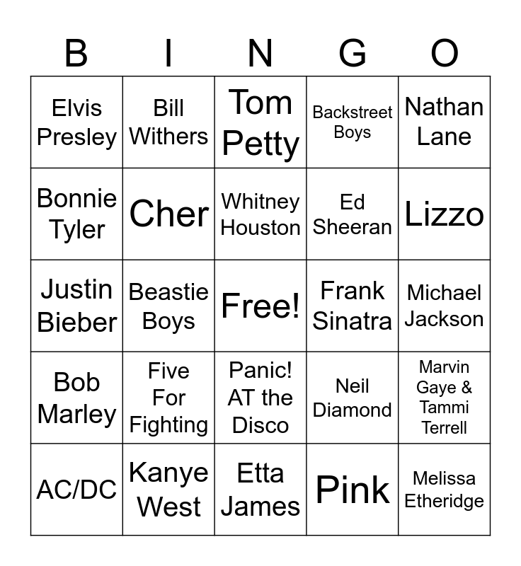 This bingo card has a free space and 24 words: Five For Fighting, Kanye West, Whitney Houston, AC/DC, Nathan Lane, Elvis Presley, Bonnie Tyler, Bill Withers, Frank Sinatra, Panic! AT the Disco, Ed Sheeran, Justin Bieber, Neil Diamond, Marvin Gaye & Tammi Terrell, Cher, Pink, Michael Jackson, Tom Petty, Lizzo, Beastie Boys, Melissa Etheridge, Bob Marley, Backstreet Boys and Etta James.