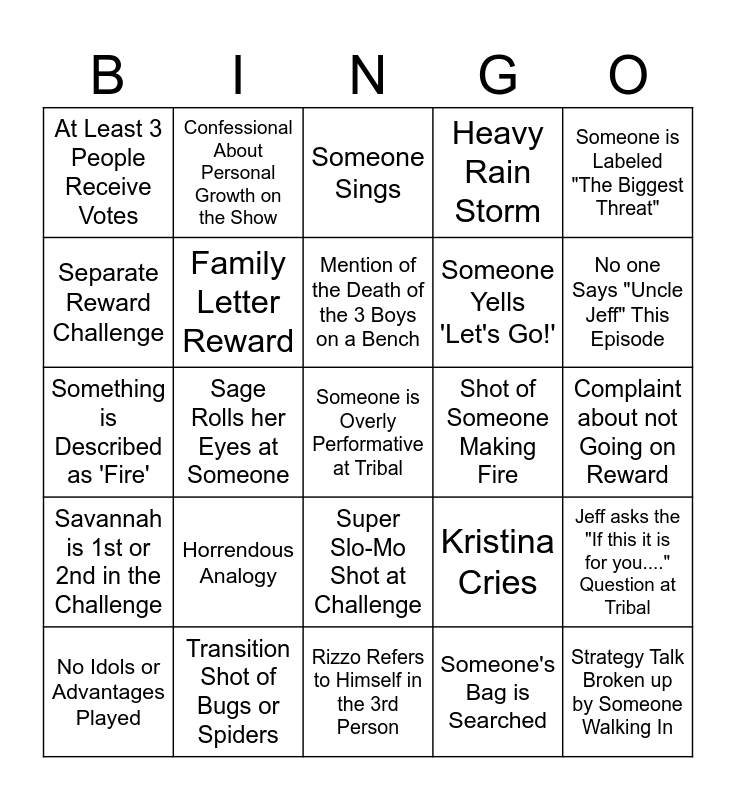 This bingo card has a free space and 29 words: No Idols or Advantages Played, "You Gotta Dig Deep!", Sage Rolls her Eyes at Someone, Jeff Reminds us how Hot it is in Fiji, At Least 3 People Receive Votes, Someone Sings, Family Letter Reward, Horrendous Analogy, Shot of Someone Making Fire, Transition Shot of Bugs or Spiders, Complaint about not Going on Reward, Strategy Talk Broken up by Someone Walking In, Rizzo Refers to Himself in the 3rd Person, Someone's Bag is Searched, No one Says "Uncle Jeff" This Episode, A Man Says the Episode Title, Super Slo-Mo Shot at Challenge, Savannah is 1st or 2nd in the Challenge, Someone is Labeled "The Biggest Threat", Something is Described as 'Fire', Kristina Cries, Over the Top Jury Bench Reaction, Someone Yells 'Let's Go!', Separate Reward Challenge, Heavy Rain Storm, Confessional About Personal Growth on the Show, Jeff asks the "If this it is for you...." Question at Tribal, Mention of the Death of the 3 Boys on a Bench and Idol Hunting Scene.