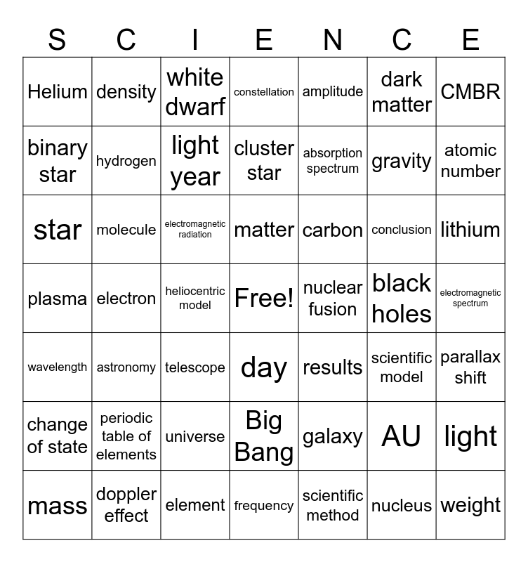 This bingo card has a free space and 48 words: galaxy, gravity, frequency, electron, electromagnetic radiation, electromagnetic spectrum, density, doppler effect, dark matter, day, CMBR, constellation, conclusion, carbon, change of state, black holes, binary star, atomic number, AU, amplitude, absorption spectrum, heliocentric model, Helium, hydrogen, light, light year, lithium, mass, matter, molecule, nucleus, nuclear fusion, parallax shift, periodic table of elements, plasma, results, scientific model, star, telescope, universe, wavelength, weight, white dwarf, element, cluster star, Big Bang, astronomy and scientific method.