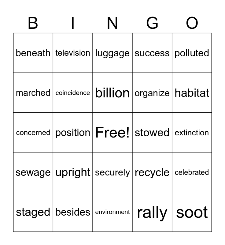 This bingo card has a free space and 30 words: besides, conference, position, compartments, beneath, luggage, coincidence, securely, stowed, environment, extinction, soot, rally, senator, habitat, refinery, recycle, sewage, upright, polluted, concerned, nationwide, television, organize, marched, success, celebrated, staged, billion and healthier.