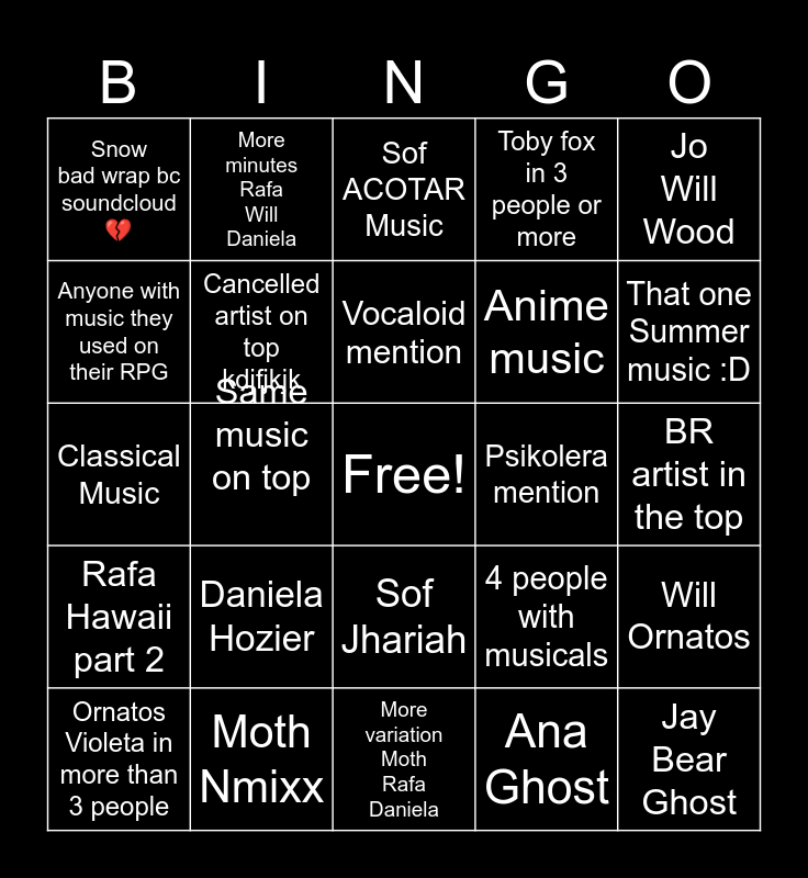 This bingo card has a free space and 24 words: Ornatos Violeta in more than 3 people, Daniela Hozier, Vocaloid mention, Ana Ghost, Jo Will Wood, Snow bad wrap bc soundcloudđź’”, More minutes Rafa Will Daniela, Sof ACOTAR Music, Psikolera mention, BR artist in the top, Classical Music, Cancelled artist on top kdjfjkjk, 4 people with musicals, Will Ornatos, Anyone with music they used on their RPG, Moth Nmixx, More variation Moth Rafa Daniela, Toby fox in 3 people or more, That one Summer music :D, Rafa Hawaii part 2, Same music on top, Sof Jhariah, Anime music and Jay Bear Ghost.