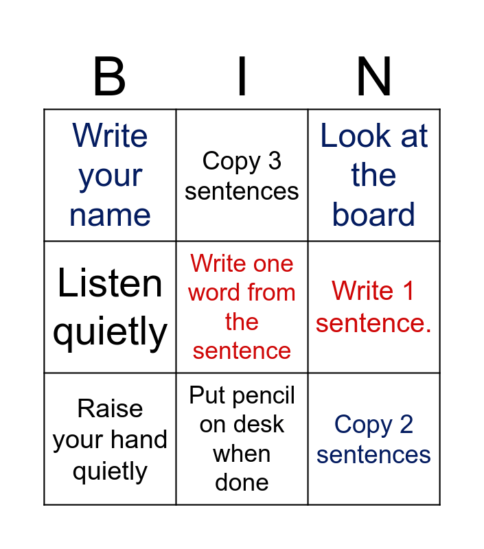 This bingo card has a free space and 8 words: Write 1 sentence., Look at the board, Copy 3 sentences, Raise your hand quietly, Write your name, Copy 2 sentences, Listen quietly and Put pencil on desk when done.