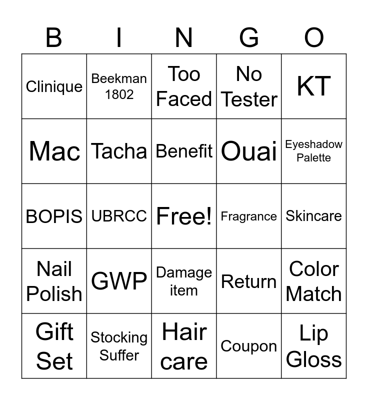 This bingo card has a free space and 24 words: GWP, Stocking Suffer, Benefit, Gift Set, KT, Clinique, Mac, Beekman 1802, Fragrance, Damage item, Ouai, BOPIS, Return, Color Match, Tacha, Coupon, Skincare, Too Faced, Eyeshadow Palette, UBRCC, Lip Gloss, Nail Polish, No Tester and Hair care.
