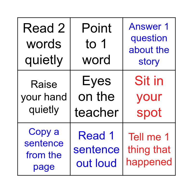 This bingo card has a free space and 8 words: Sit in your spot, Answer 1 question about the story, Point to 1 word, Copy a sentence from the page, Read 2 words quietly, Tell me 1 thing that happened, Raise your hand quietly and Read 1 sentence out loud.