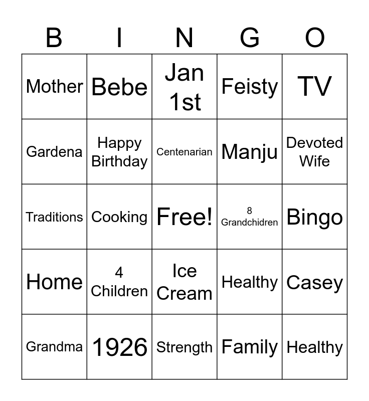 This bingo card has a free space and 29 words: Grandma, 100 years old, Cooking, Memories, Mother, Jan 1st, Happy Birthday, 4 Children, 8 Grandchidren, 1926, Bingo, Healthy, Strength, Family, Devoted Wife, Comfort Food, Ice Cream, Home, TV, Traditions, Healthy, Makeup, Manju, Gardena, Feisty, Bebe, Casey, Centenarian and New Years Day.